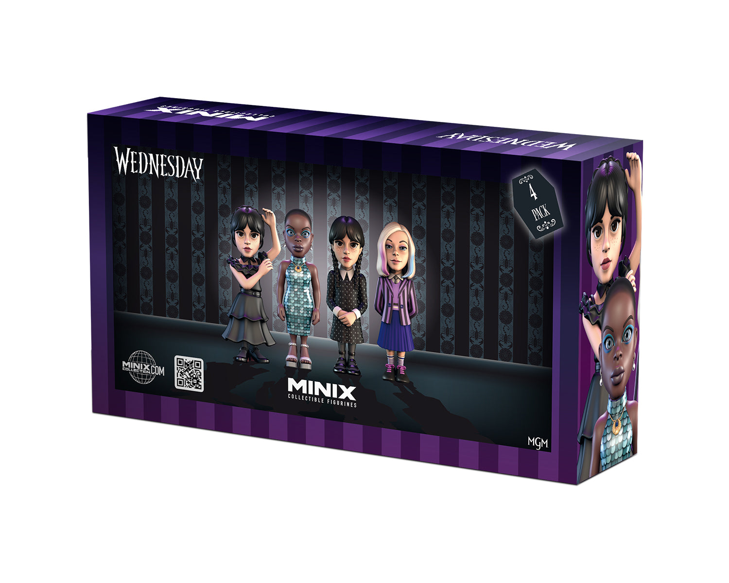Duik in de mysterieuze wereld van Wednesday met deze exclusieve MINIX 4-Pack Special Edition! Deze set van vier 7 cm hoge figuurtjes brengt jouw favoriete personages uit de serie tot leven: Mercredi Addams, Mercredi in haar iconische baljurk, Enid Sinclair, en Bianca Barclay. Elk figuurtje is ontworpen met oog voor detail en perfect voor fans van de duistere humor en gotische flair van de populaire Netflix-serie.
