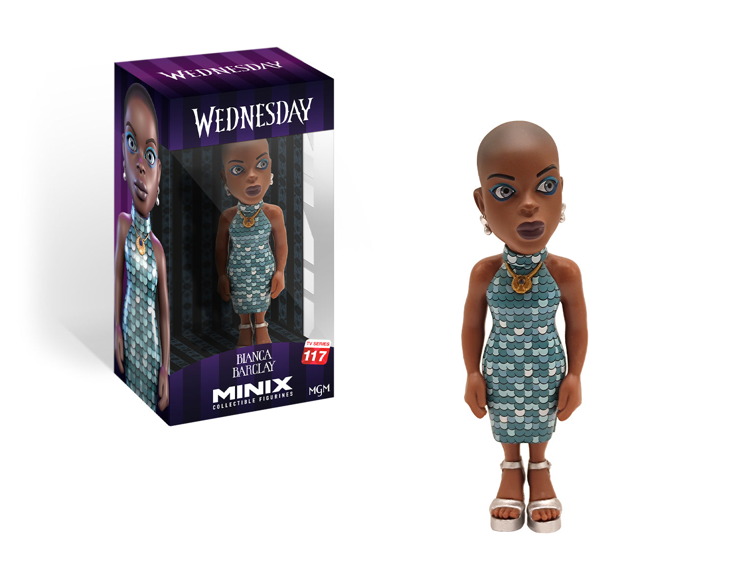 Duik in de mysterieuze wereld van Nevermore Academy met deze MINIX-figuur van Bianca Barclay. Deze 12 cm hoge pop vangt de stijl en elegantie van Bianca, de zelfverzekerde en getalenteerde sirene uit de populaire serie Wednesday.
